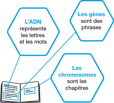 L'ADN est « lu » par la cellule et fournit ces instructions. Un gène est une partie de l'ADN qui programme une instruction spécifique. Les gènes eux-mêmes sont regroupés en unités distinctes appelées chromosomes.