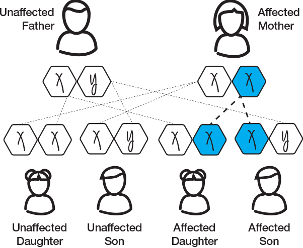 Women have two X chromosomes – sons and daughters will randomly receive one of these X chromosomes